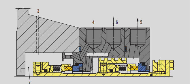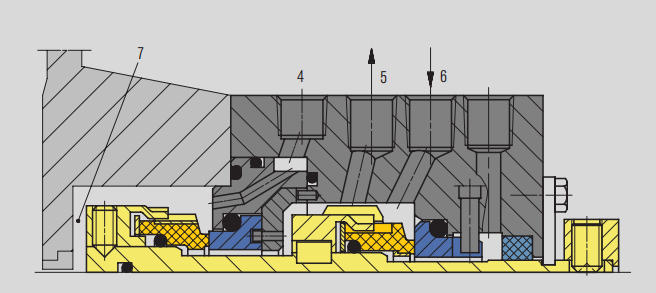 1.Z vysokotlaké oblasti čerpadla (výtlak čerpadla nebo výtlačné potrubí čerpadla) 3. Proplachovací port (F) 4. Chladič (Q) 5. Vypouštěcí otvor (D) 6.Těsnicí komora