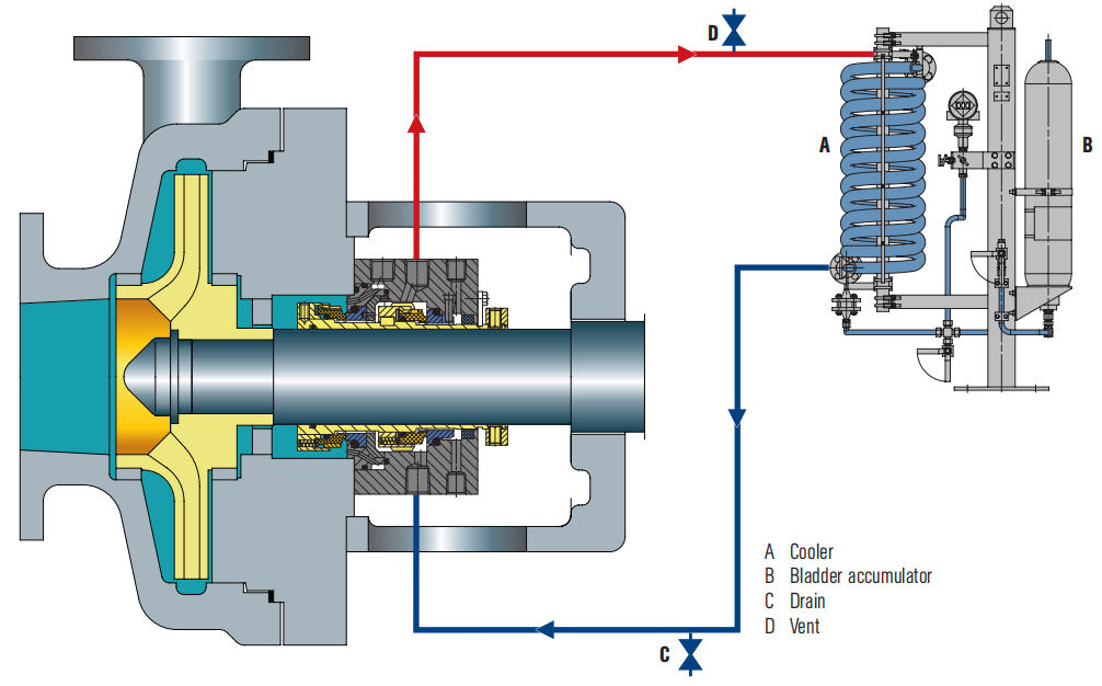 Průtok proplachovací kapaliny musí být dostatečný pro odvod tepla z komory mechanické ucpávky.